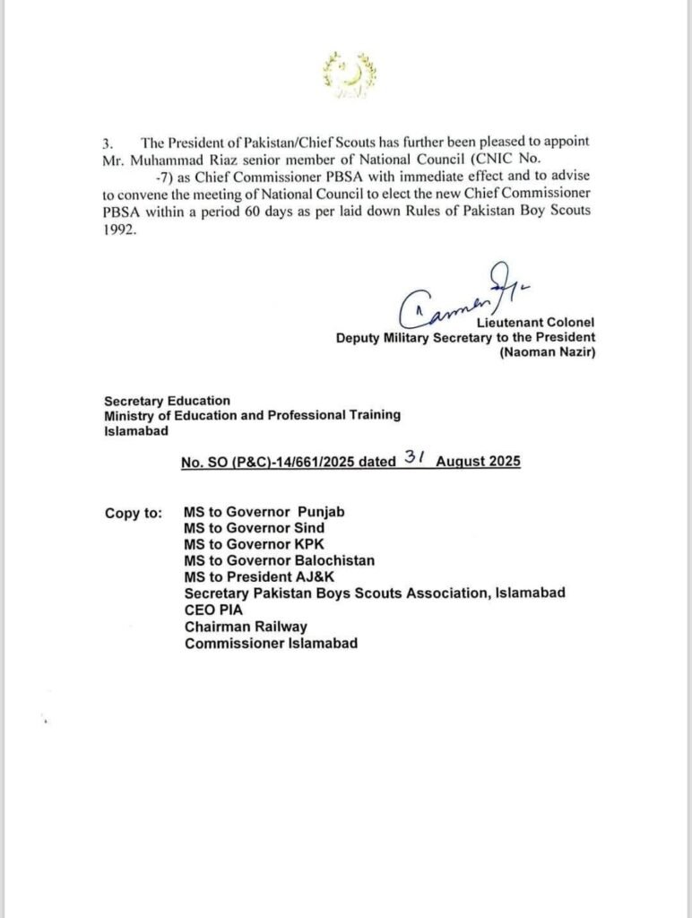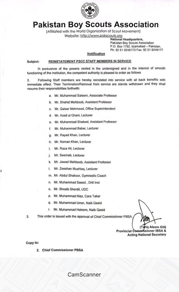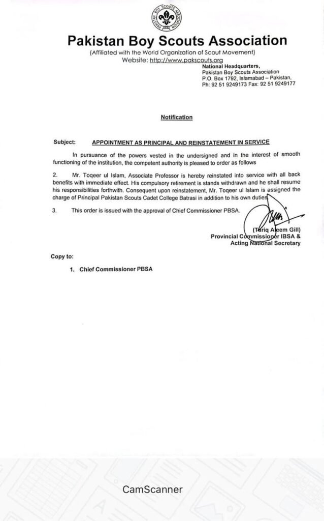 جنوری 2025 میں پرنسپل کی تعیناتی کے بعد بھی پرنسپل کے چیک پر بنک کے لیا دستخط جو ڈی ڈی او کے اختیارات ہوتے ہیں وہ نصیر جو پہلے عارضی پرنسپل تھا اس کے پاس ہی ہیں، جو کہ سرفراز قمر دھا کا الائچی اور رازدار اور محتاط افسر ہے۔ 30 جولائی 2025 کو اس کی ریٹائرمنٹ کے بعد بھی ڈی ڈی او کے اختیارات اسی کے پاس ہیں اور وہ صرف دھا کے کہنے پر ہر چیز پر وہ قانونی ہے یا نہیں دیکھا بغیر دستخط کر دیتا ہے۔ نصیر کے خلاف انکوائری جاری ہونے کے باوجود اسے سی پی فنڈ اور دیگر مراعات کی ادائیگیاں کر دی گئیں۔اب صدر مملکت نے ایکشن لیکر چیف کمشنر پاکستان بوائز سکاوٹس ایسی ایشن انجنئیر سرفراز قمر ڈھا کو عہدے سے برطرف کرکے،کیڈٹ کالج سے نکالے گئیے سابق پرنسپل توقیر الاسلام کو دوبارہ پرنسپل تعینات کرنے کے احکامات دے دیے ہیں اور کیڈٹ بٹراسی سے غیر قانونی طور پر نکالے گئیے جملہ سٹاف کو بحال کرنے کے احکامات بھی جاری کرتے ہوئے لوٹ مار اور بد عنوانی میں ملوث سرفراز قمر ڈاھا کے کارندوں اور گروہ کو معطل کرکے تحقیقات کا آغاز کر دیا ہے۔